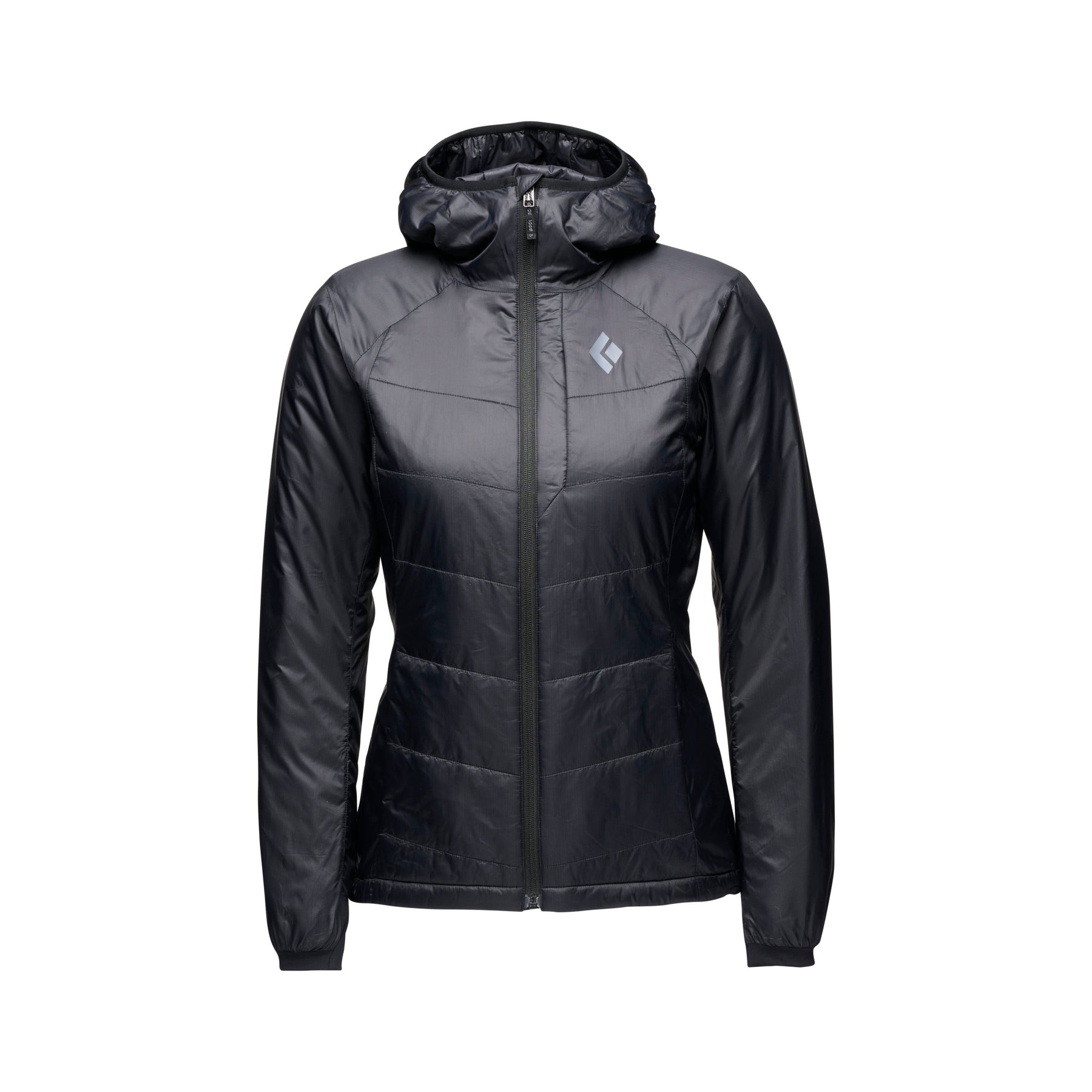 Black Diamond Women’s Solution Hoody with synthetic insulation, stretch-woven exterior, insulated hood, and women’s-specific performance fit.