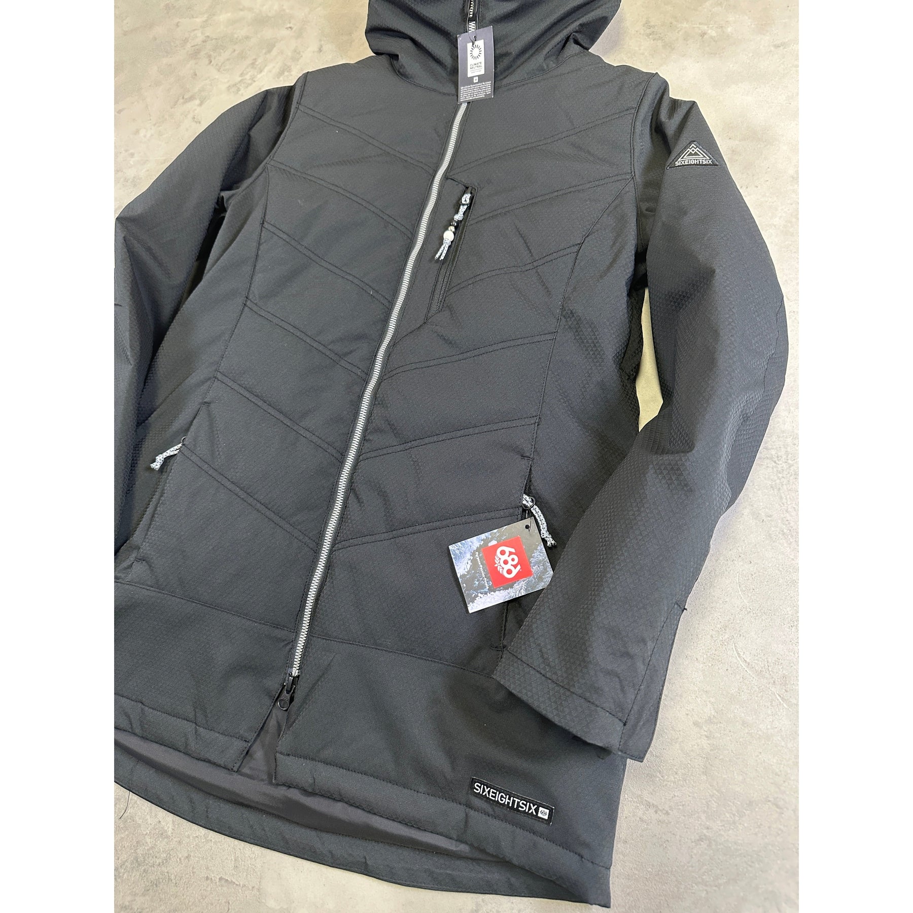Additional technical features include a helmet-compatible adjustable hood, powder skirt, adjustable hem, wrist gaiters with thumb grips, glove-link loops, and a collection of internal and external pockets for goggles, essentials, and lift-access gear. The regular, hip-length silhouette provides mobility and layering room while maintaining a clean, streamlined look.