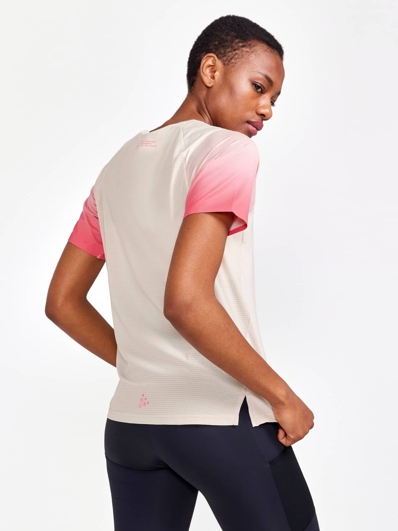 Craft Pro Trail SS Tee Women’s in Ecru Multi, lightweight breathable trail running shirt with moisture-wicking performance and athletic fit. ON MODEL