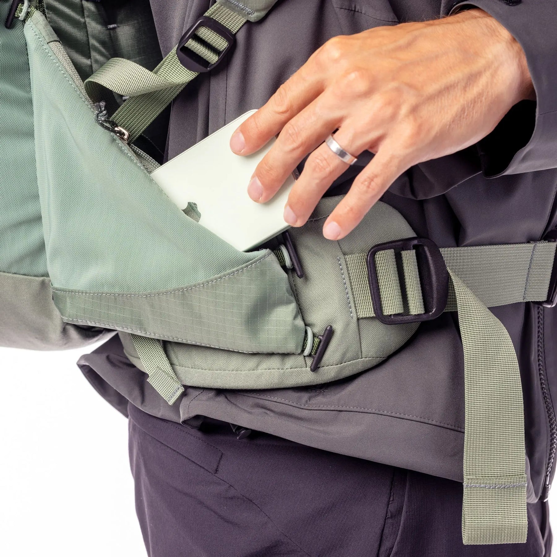 • Removable hip belt with stretch mesh and water-resistant pockets.