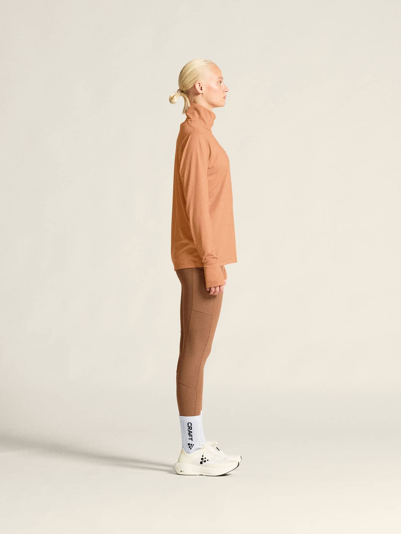 Person wearing a brown long-sleeve top and pants on a beige background